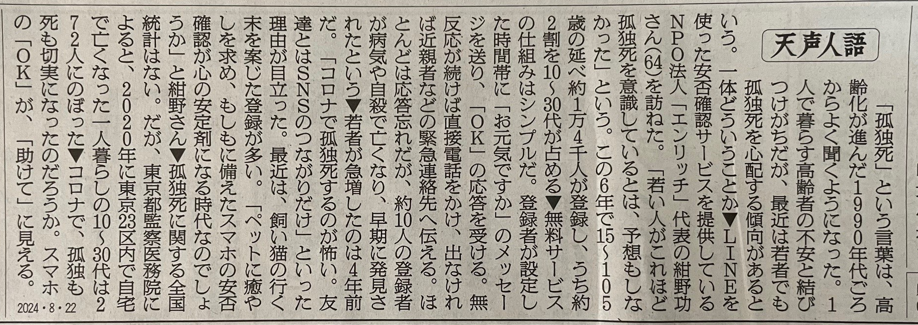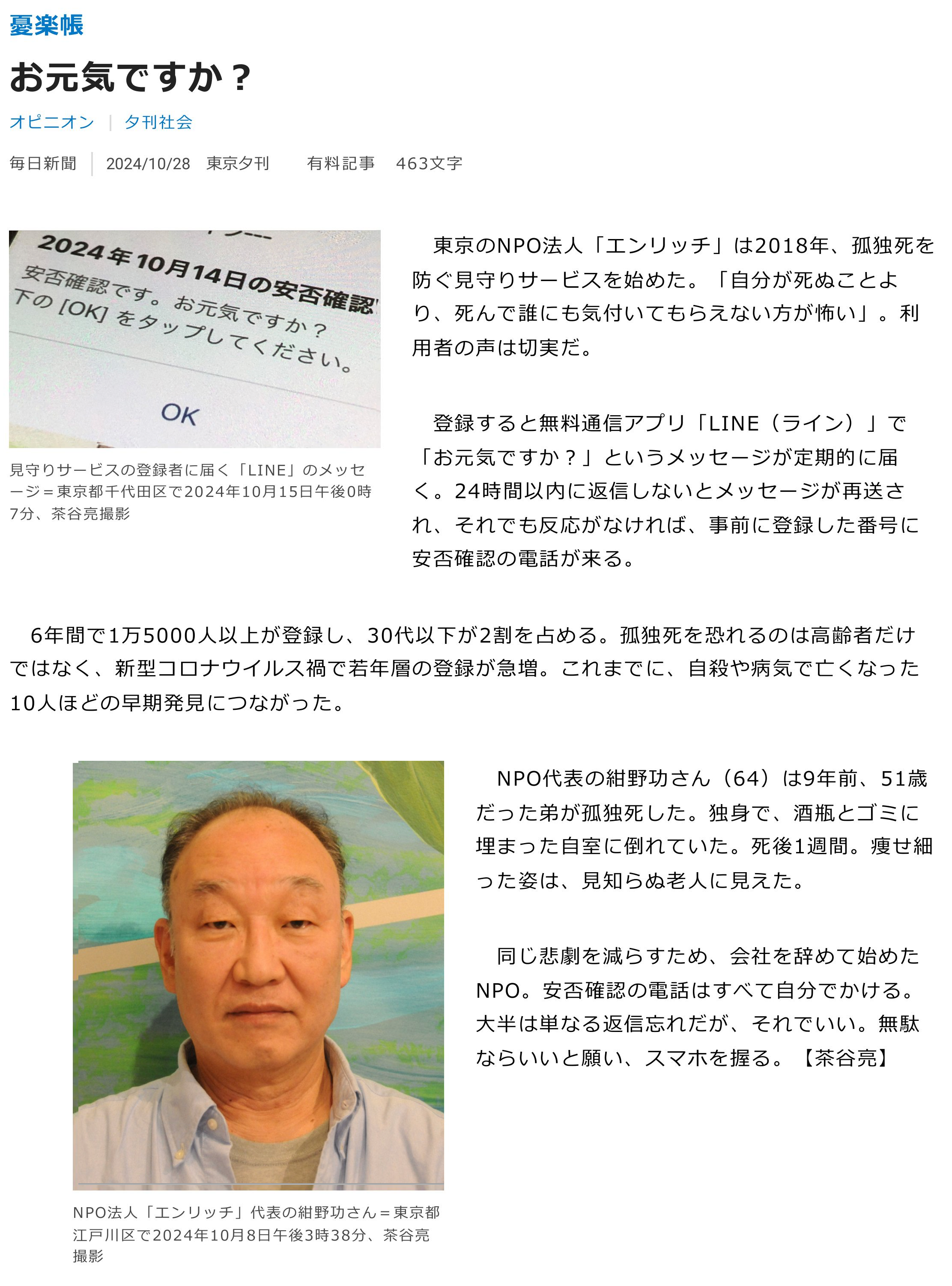 TBS NEWS DIG 報道特集記事「増える若者の孤独死セルフネグレクトの実態」 2024.07.28